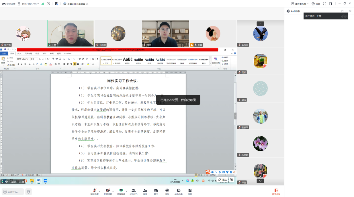 会上,齐峰对公司岗位实习的前期工作、目前状况以及公司对岗位实习工作的最新要求做了详细汇报。王雷对下一步公司岗位实习工作进行部署并提出要求:一是做好岗位实习的动态管理,掌握员工实习真实情况,形成班级实习管理的画像图;二是使用“公司-指导教师-企业-家长”四方联动机制,线上和线下相结合开展员工防诈骗、急救知识等专题培训;三是发现问题提前介入,将问题解决在萌芽状态;四是对于特殊情况的员工提供一对一精准帮扶,帮助员工顺利完成岗位实习。最后强调岗位实习是应用型人才培养的关键环节,要求全体教师高度重视,确保实习工作“安全有序、专业对口、实效突出”。