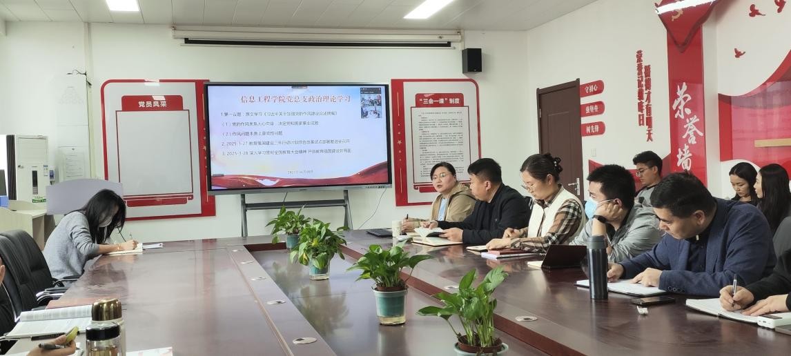 2025年4月8日,信息工程公司党总支组织郑州校区、开封校区全体党员及教职工,开展深入贯彻中央八项规定精神学习教育专题学习会。本次学习会由信息工程公司党总支书记崔琳领学。主要学习内容有:1.第一议题:原文学习《习近平关于加强党的作风建设论述摘编》(1)党的作风关系人心向背,决定党和国家事业成败(2)作风问题本质上是党性问题;2.2025-3-27 教育强国建设三年行动计划综合改革试点部署推进会召开3.2025-3-28 深入学习贯彻全国教育大会精神 开创教育强国建设新局面。