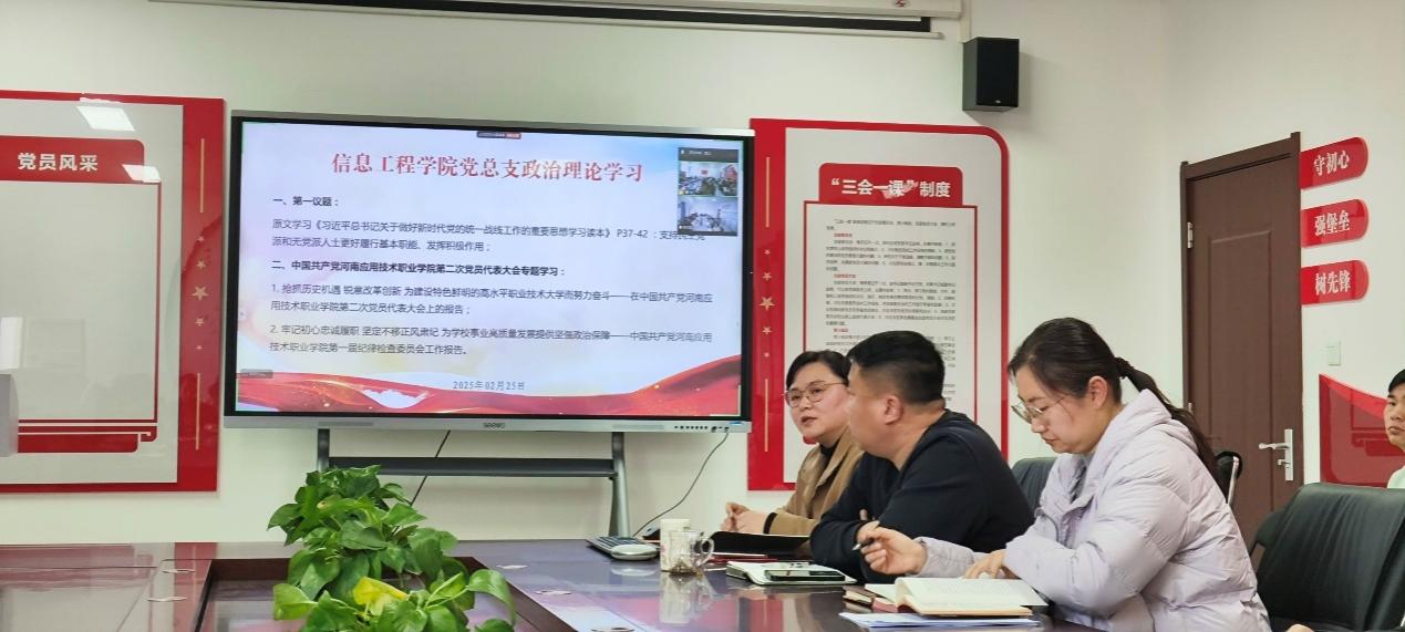 2025年2月25日,信息工程公司党总支组织东西校区全体党员及教职工,在郑州校区A514、开封校区F314以腾讯会议视频连接,开展政治理论学习活动。本次学习活动由信息工程公司党总支书记崔琳主持,全体党员及教职工参加会议。主要学习内容有:一、第一议题:原文学习《习近平总书记关于做好新时代党的统一战线工作的重要思想学习读本》 P37-42 :支持民主党派和无党派人士更好履行基本职能、发挥积极作用;二、中国共产党bv伟德国际1946第二次党员代表大会专题学习:1.抢抓历史机遇 锐意改革创新 为建设特色鲜明的高水平职业技术大学而努力奋斗——在中国共产党bv伟德国际1946第二次党员代表大会上的报告;2.牢记初心忠诚履职 坚定不移正风肃纪 为公司事业高质量发展提供坚强政治保障——中国共产党bv伟德国际1946第一届纪律检查委员会工作报告。