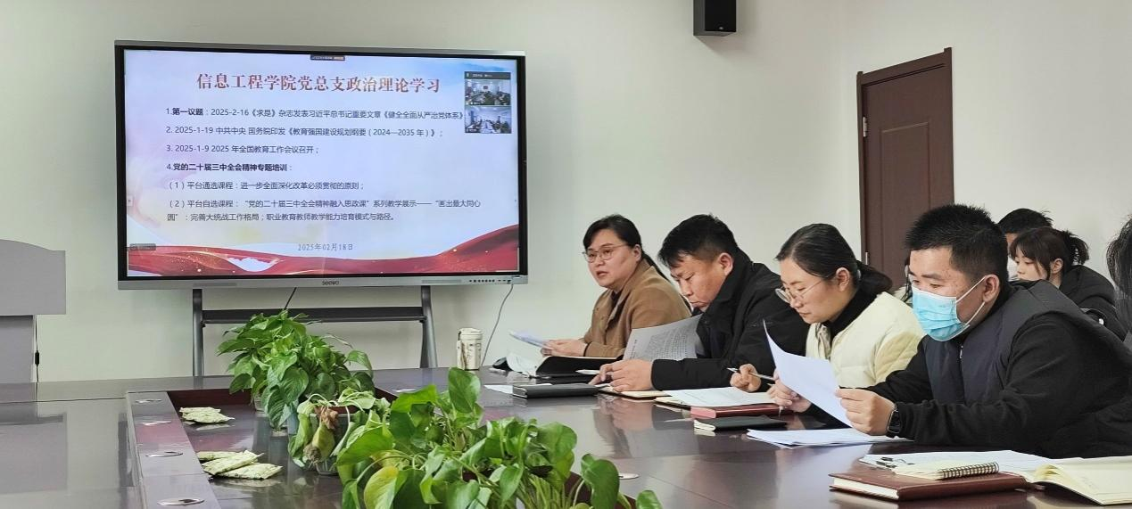 2025年2月18日,信息工程公司党总支组织两校区全体党员及教职工,在郑州校区A514、开封校区F314以腾讯会议视频连接,开展政治理论学习。本次学习活动由信息工程公司党总支书记崔琳主持,全体党员及教职工参加会议。主要学习内容有:1.第一议题:2025-2-16《求是》杂志发表习近平总书记重要文章《健全全面从严治党体系》;2.2025-1-19 中共中央 国务院印发《教育强国建设规划纲要(2024—2035 年)》;3.2025-1-9 2025 年全国教育工作会议召开;4.党的二十届三中全会精神专题培训:(1)平台通选课程:进一步全面深化改革必须贯彻的原则;(2)平台自选课程:“党的二十届三中全会精神融入思政课”系列教学展示——“画出最大同心圆”:完善大统战工作格局;职业教育教师教学能力培育模式与路径。